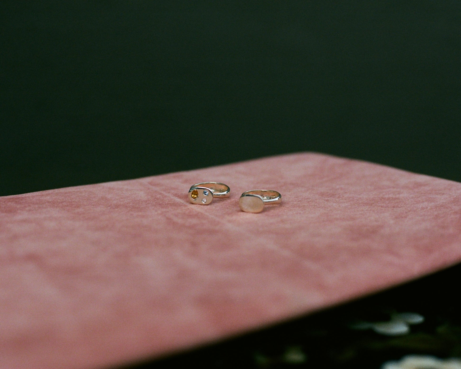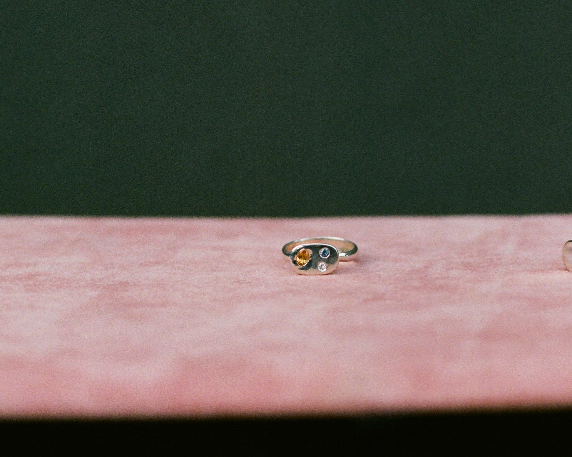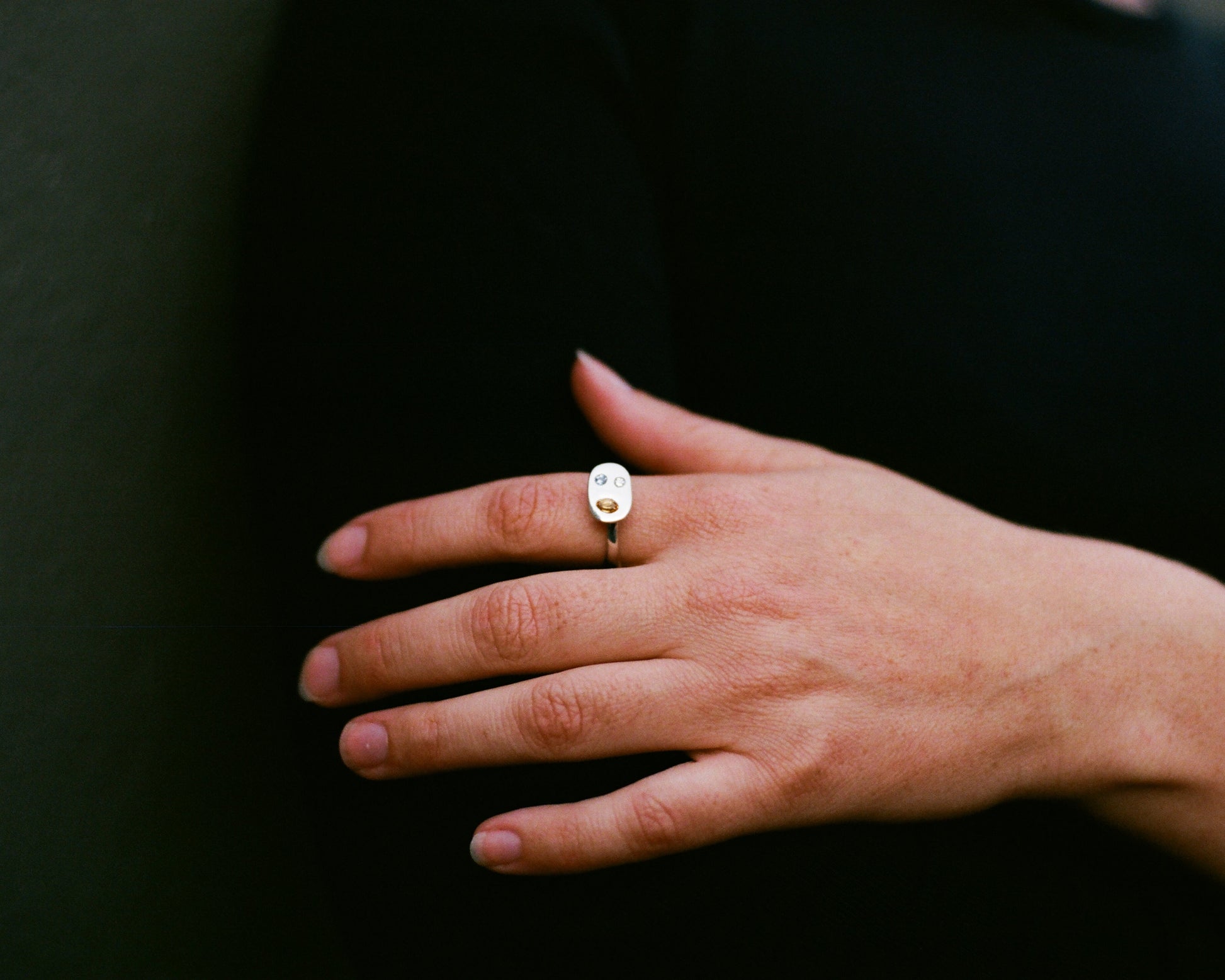 My take on a classic signet ring, inspired from a family ring. The lifted face adds a light and airy dimension, complimenting the carved tapered band. This gem set option is a fun choice, and customization is available.